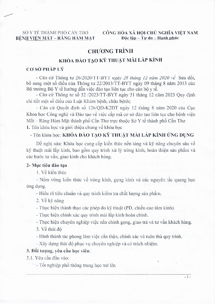 Thông báo Chương trình khóa đào tạo mài lắp kính
